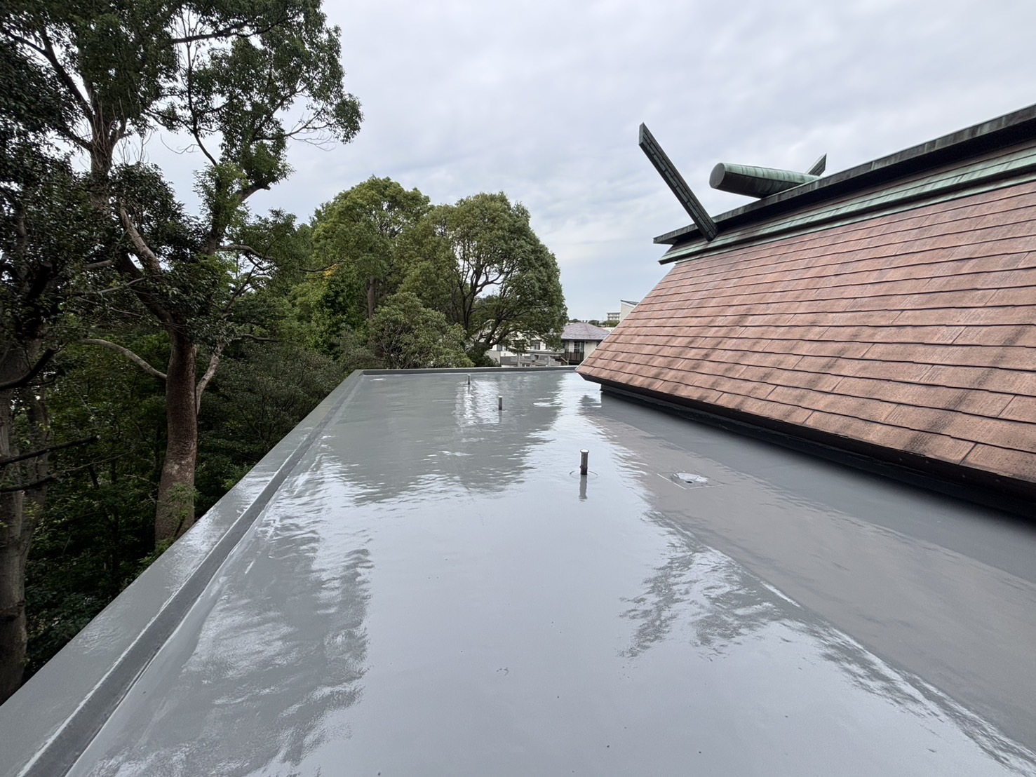 お客様から神社の雨漏りのご相談がありました。屋根の防水部分の劣化により雨漏りしてしまっていたので、防水工事を行いました。